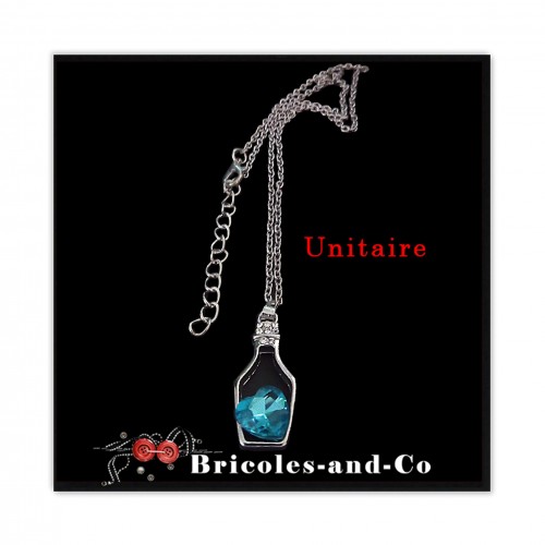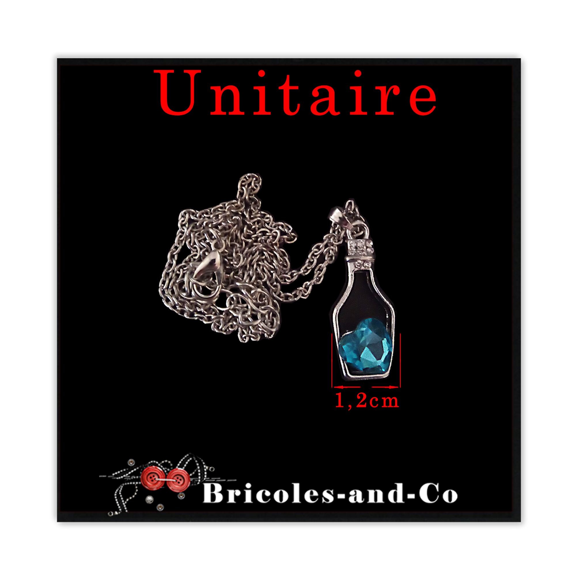 Pendentif bouteille, cœur bleu, bouchon strass, avec chaine argenté Taille : 3cmx1,2cm chaine 40cm environ Bijoux cadeau idéal pour fête des mères , saint valentin, mariage ou pour se faire plaisir.…