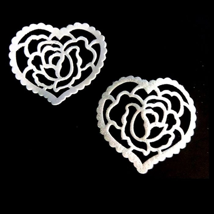 Coeur garnie d'une rose ton blanc à paillettes. Sticker embellissement romantique .Taille environ 7,5cmx7cm, 1mm d'épaisseur.
