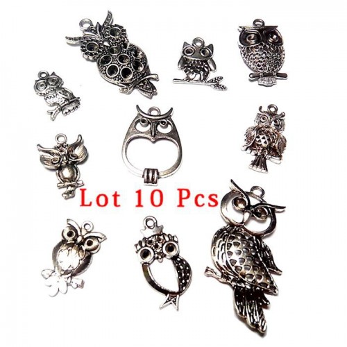 Pendentifs charms hibou argenté . 10 designs différents. Taille environ grand 55mm, moyen 32mm et petit2,2mm.