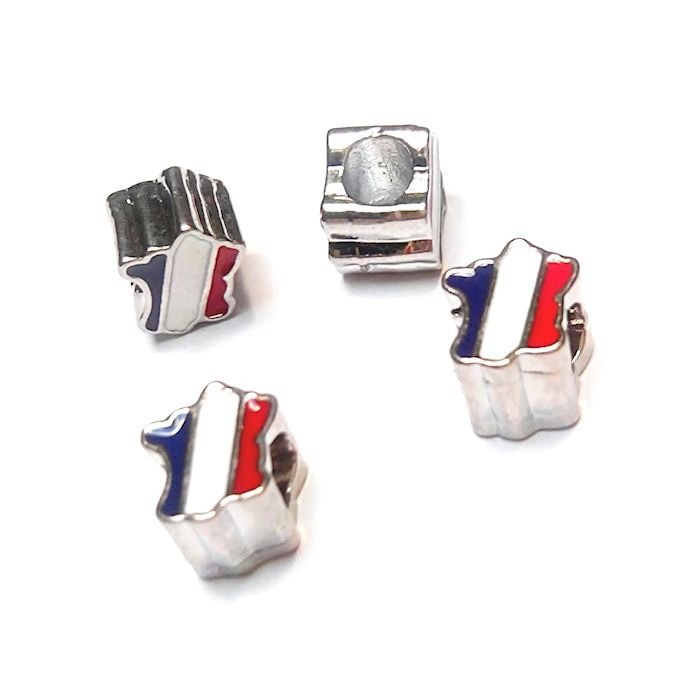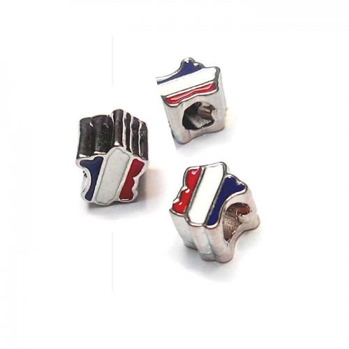 Perle carte France aux couleurs du drapeau bleu blanc et rouge ton argenté. Pour création de bijoux, bracelet. Taille environ 9X7mm , beau design.