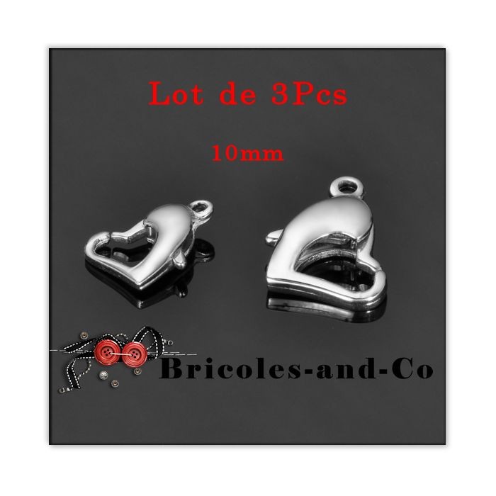 Fermoir homard cœur ton argenté petit taille 10mm. Lot de 3Pcs