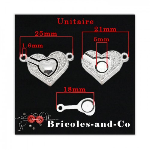 Fermoir magnétique cœur argenté Modèle A Taille 25mm épaisseur 6mm taille trou 1.6mm taille aimant 5mm de diamètre.