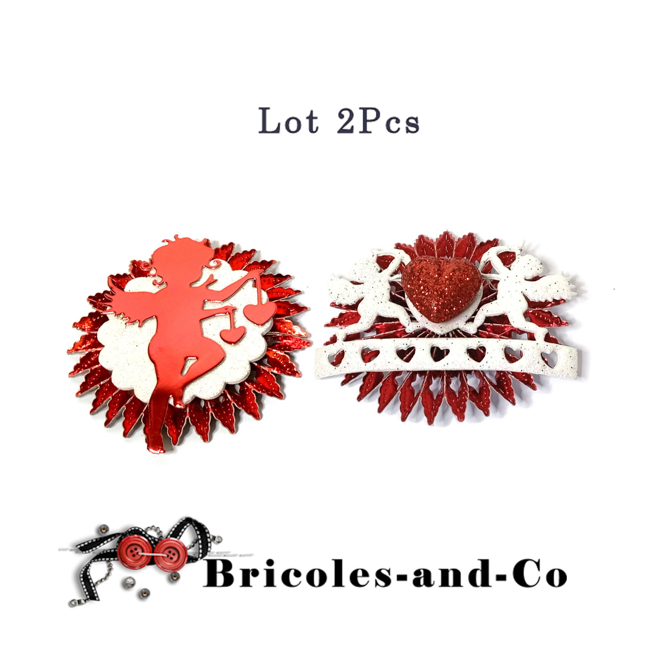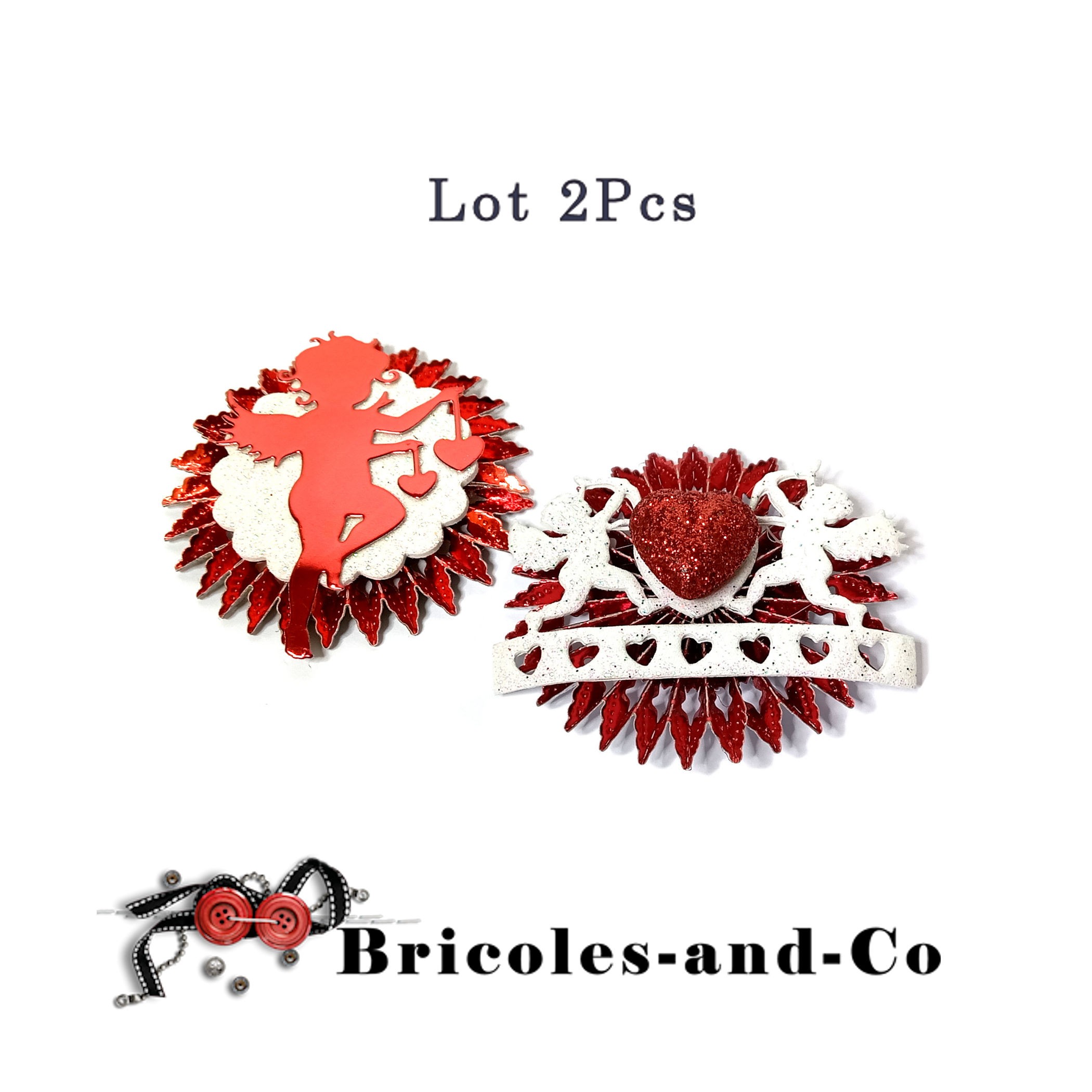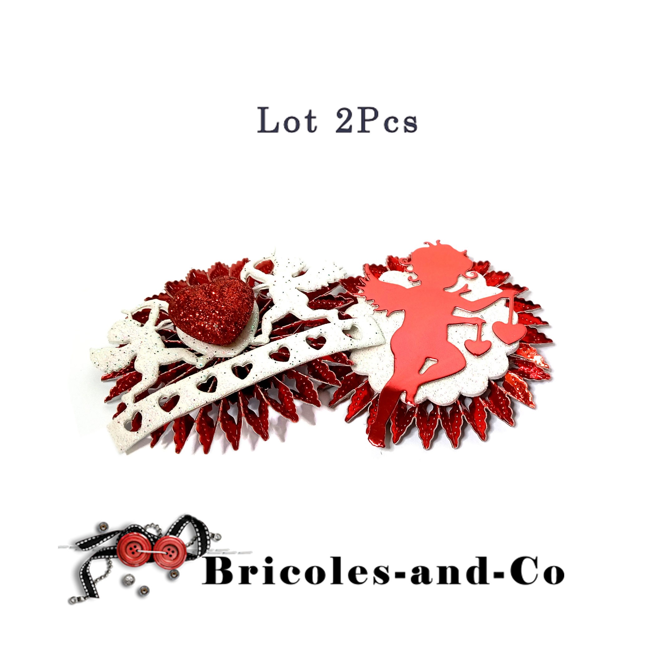 - Rosette rouge brillante, décoration en mousse blanche paillettes chérubins et cœurs et cœur rouge paillettes.