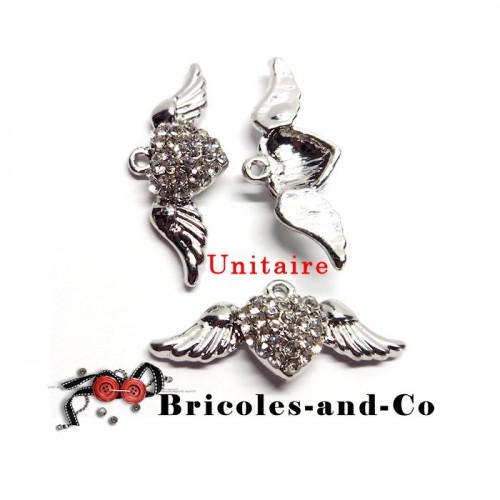 Pendentif cœur argenté strass Modèle B ailes. Taille 1,2cm hauteur et 3 cm longueur. Accessoire base pour vos créations : bijoux de sac, bracelet, pendentif.