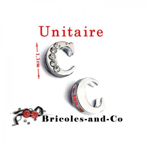 Unitaire : Perle lettre, C strass demie, curseur perle passe ruban ou bracelet 8mm, une note chic sur tous vos accessoires déco