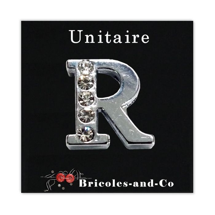 Unitaire : Perle lettre, R strass demie, curseur perle passe ruban ou bracelet 8mm, une note chic sur tous vos accessoires déco