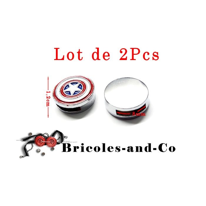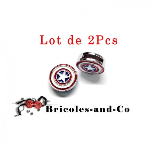 Lot de 2Pcs : Perle Héro, Captain America A, curseur représentant bouclier rond, perle passe ruban ou bracelet 8mm, pour une décoration super-héro sur tous vos accessoires, carte , scrapbooking …