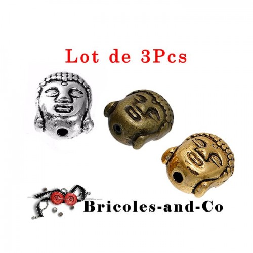 Lot de 3Pcs Mixed : Perle Bouddha, A argenté, bronze et doré, perle tibétain zen, pour création bijoux, bracelet…