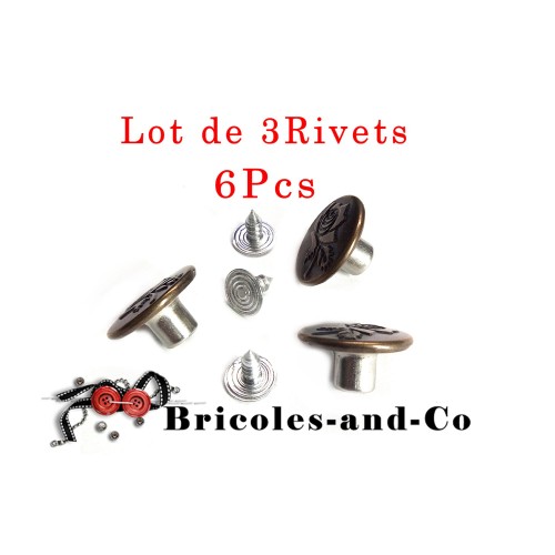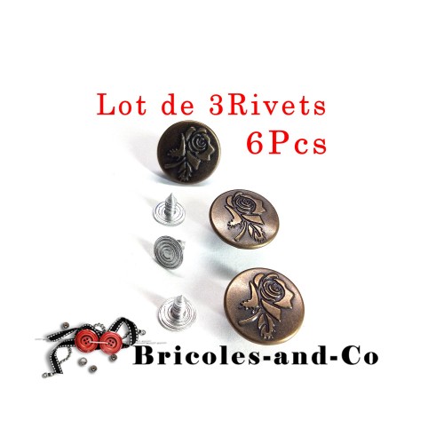 Lot de 3 rivets bouton-pression fleur, C design rond rose bronze. 6 Pcs.